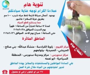 وأشارت الشركة إلى أن سبب انقطاع المياه جاء نتيجة تنفيذ أعمال صيانة لازمة لخط مياه قطر 1000 مم بطريق عزبة السلام – عاشور.