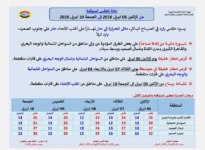 بينما يكون نشاط رياح من الإثنين 6 أبريل إلى الجمعة 10 أبريل على أغلب الأنحاء على فترات متقطعة.