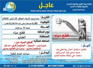 وأوضحت الشركة أن تنفيذ هذه الأعمال سيترتب عليه توقف بعض محطات المياه، مما يؤدي إلى انقطاع المياه مؤقتًا لمدة 9 ساعات، اعتبارًا من الساعة السادسة صباح يوم الأربعاء الموافق 25 فبراير 2026م وحتى الساعة الثالثة عصرًا من نفس اليوم، مما يؤثر على المناطق التالية: «عزبة بدر – السيول – المشايعة قبلي – مدخل المشايعة بحري – وجزء من الغنايم بحري».