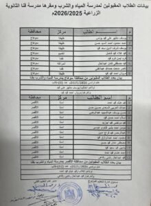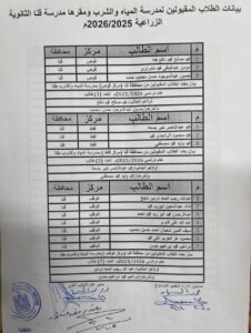 أعلنت شركة مياه الشرب والصرف الصحي بقنا، أسماء الطلاب المقبولين للالتحاق بفصول التعليم والتدريب المزدوج “تخصص فني تشغيل وصيانة شبكات مياه وصرف صحي”، الملحقة بمدرسة قنا الثانوية الزراعية، وذلك للعام الدراسي 2025 – 2026.