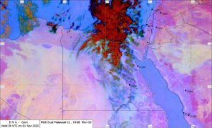 بينما أثرت الخلايا الرعدية بقوة على المنيا ومناطق من شمال الصعيد والصحراء الغربية يصاحبها سقوط أمطار متفاوتة الشدة.