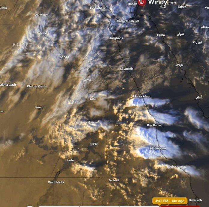 تشير آخر صور الأقمار الصناعية إلى استمرار نشاط حالة من عدم الاستقرار الجوي فوق مناطق من جنوب سلاسل جبال البحر الأحمر وجنوب الصعيد، خاصة بمحافظتي الأقصر وأسوان. وتظهر المتابعة تكاثفًا ملحوظًا للسحب الركامية الرعدية المصحوبة بأمطار متفاوتة الشدة، قد تصل إلى الغزيرة في بعض الفترات، ما يرفع من احتمالية تكوّن السيول على المناطق الجبلية والوديان الممتدة نحو حلايب وشلاتين ورأس بناس ومرسى علم.