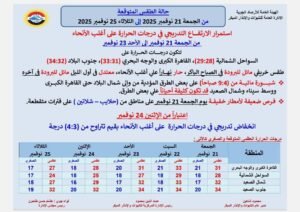 أصدرت الهيئة العامة للأرصاد الجوية بيانًا شاملاً حول حالة الطقس المتوقعة في الفترة من الجمعة 21 نوفمبر حتى الثلاثاء 25 نوفمبر 2025، موضحة استمرار الارتفاع التدريجي في درجات الحرارة على أغلب الأنحاء حتى يوم الأحد 23 نوفمبر، يعقبه انخفاض ملحوظ اعتبارًا من الاثنين 24 نوفمبر.
