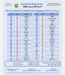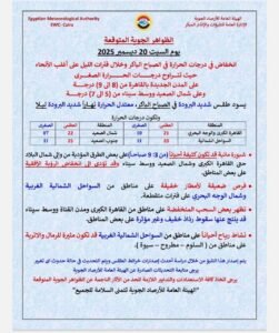 وأشارت الهيئة إلى فرص ضعيفة لأمطار خفيفة على مناطق من السواحل الشمالية الغربية وشمال الوجه البحري على فترات متقطعة.