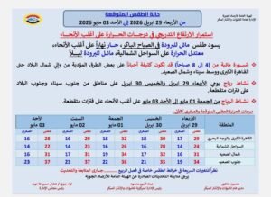 كشفت هيئة الأرصاد الجوية عن توقعاتها لحالة الطقس في الفترة من الأربعاء 29 أبريل 2026 إلى الأحد 3مايو 2026، مشيرة إلى استمرار الارتفاع التدريجي في درجات الحرارة على أغلب الأنحاء، حيث يسود طقس مائل للبرودة في الصباح الباكر، حار نهاراً على أغلب الأنحاء معتدل الحرارة على السواحل الشمالية، مائل للبرودة ليلاً.