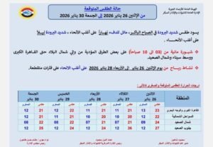 كشفت هيئة الأرصاد عن حالة الطقس المتوقعة من الإثنين 26 يناير 2026 إلى الجمعة 30 يناير 2026، مشيرة إلى أنه يغلب عليها طقس شديد البرودة في ليلاً وفي الصباح الباكر، مائل للدفء نهاراً على أغلب الأنحاء.