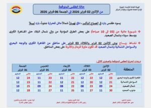 أعلنت هيئة الأرصاد الجوية عن توقعاتها لحالة الطقس من الإثنين 2 فبراير 2026 إلى الجمعة 6 فبراير 2026، حيث يسود طقس بارد في الصباح الباكر، دافئ نهاراً شمالاً مائل للحرارة جنوباً، بارد ليلاً.