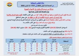 توقعت هيئة الأرصاد الجوية حالة الطقس من الجمعة 13 فبراير 2026 إلى الثلاثاء 17 فبراير 2026، مشيرة إلى حالة من عدم الاستقرار في الأحوال الجوية.