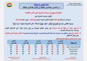 توقعت هيئة الأرصاد الجوية حالة الطقس  من الخميس 5 إلى الإثنين 9 فبراير، مشيرة ارتفاع تدريجي في درجات الحرارة على أغلب الأنحاء لتكون درجات الحرارة على السواحل الشمالية (25:23) ، القاهرة الكبرى والوجه البحرى (26:24) ، جنوب البلاد (31:25)، حيث  يسود طقس بارد في الصباح الباكر ، دافىء نهاراً شمالاً مائل للحرارة جنوباً ، بارد ليلاً