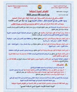 بينما تظهر  فرص أمطار خفيفة قد تكون متوسطة ورعدية أحياناً على مناطق من وسط وجنوب الصعيد على فترات متقطعة.