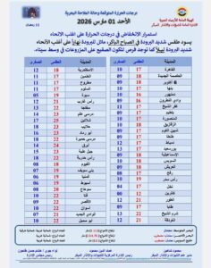 ودعت الهيئة المواطنين إلى اتخاذ التدابير اللازمة، خاصة خلال ساعات الليل والصباح الباكر.