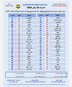 وأشارت الهيئة إلى وجود فرص أمطار خفيفة على مناطق من السواحل الشمالية وشمال الوجه البحرى على فترات متقطعة.