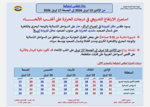 أعلنت هيئة الأرصاد الجوية حالة الطقس المتوقعة من الإثنين 13 أبريل 2026 إلى الجمعة 17 أبريل 2026، مشيرة إلى استمرار الارتفاع التدريجي في درجات الحرارة على أغلب الأنحاء.