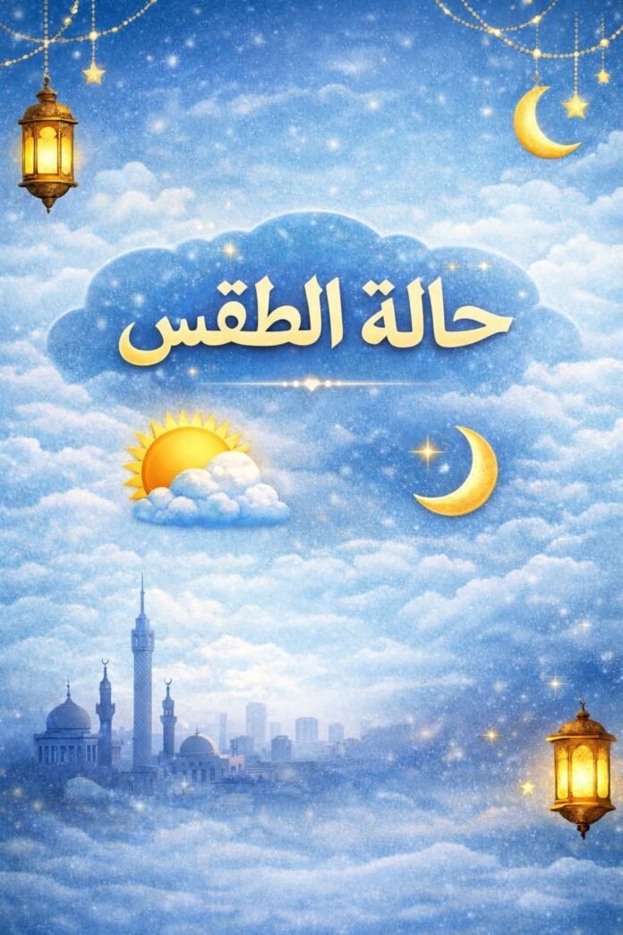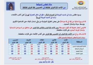 كشفت هيئة الأرصاد الجوية عن حالة الطقس من الأحد 22 فبراير 2026 إلى الخميس 26 فبراير 2026، مشيرة إلى أنه يسود طقس بارد إلى شديد البرودة في الصباح الباكر، دافئ إلى مائل للحرارة نهارًا على أغلب الأنحاء بارد إلى شديد البرودة ليلاً.