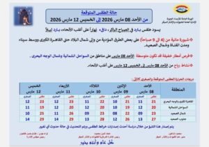 كشفت هيئة الأرصاد الجوية عن حالة الطقس من الأحد 8 مارس 2026 إلى الخميس 12 مارس 2026، مشيرة إلى أنه يسود طقس بارد في الصباح الباكر، دافئ نهارًا على أغلب الأنحاء، بارد ليلاً.