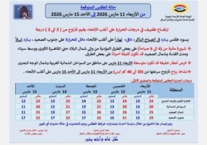 كشفت هيئة الأرصاد الجوية عن توقعاتها لحالة الطقس من الأربعاء 11 مارس 2026 إلى الأحد 15 مارس 2026، مشيرة إلى ارتفاع طفيف في درجات الحرارة علي أغلب الانحاء بقيم تتراوح من ( 2 إلى 3 ) درجة.