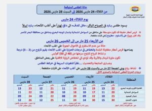 كشفت هيئة الأرصاد الجوية عن حالة الطقس من الثلاثاء 24 مارس 2026 إلى السبت 28 مارس 2026.