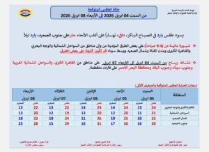 كشفت هيئة الأرصاد الجوية عن حالة الطقس من السبت 4 أبريل 2026 إلى الأربعاء 8 أبريل 2026، مشيرة إلى أنه يسود طقس بارد في الصباح الباكر، دافئ نهاراً على أغلب الأنحاء حار على جنوب الصعيد، بارد ليلاً.