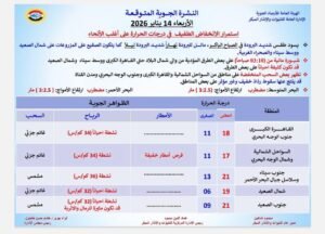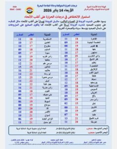 أكدت هيئة الأرصاد الجوية استمرار الانخفاض الطفيف في درجات الحرارة على أغلب الأنحاء، حيث يسود طقس شديد البرودة في الصباح الباكر، مائل للبرودة نهاراً شديد البرودة ليلاً، كما يتكون الصقيع على المزروعات على شمال الصعيد ووسط سيناء والصحراء الغربية.