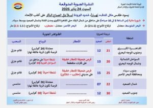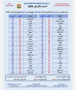 وأكدت الهيئة ظهور شبورة مائية من الساعة 3 إلى 10 صباحاً على مناطق من شمال البلاد حتى القاهرة الكبرى ومدن القناة وشمال الصعيد ووسط سيناء.