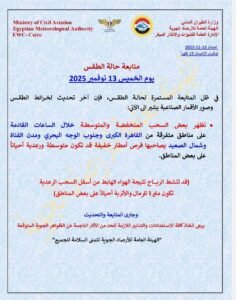 تظهر بعض السحب المنخفضة والمتوسطة خلال الساعات القادمة على مناطق متفرقة من القاهرة الكبرى وجنوب الوجه البحري ومدن القناة وشمال الصعيد يصاحبها فرص أمطار خفيفة قد تكون متوسطة ورعدية أحياناً على بعض المناطق.