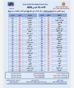 وهذا بيان بدرجات الحرارة المتوقعة والظواهر الجوية..