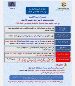 اعلنت الهيئة العامة للأرصاد الجوية توقعاتها لحالة الطقس اليوم الأحد 15 مارس 2026، مشيرة إلى أنه يسود تحسن في الرؤية الأفقية مع هدوء نسبي في سرعات الرياح على أغلب الأنحاء، مع فرص لسقوط أمطار متفاوتة الشدة على عدد من المناطق.