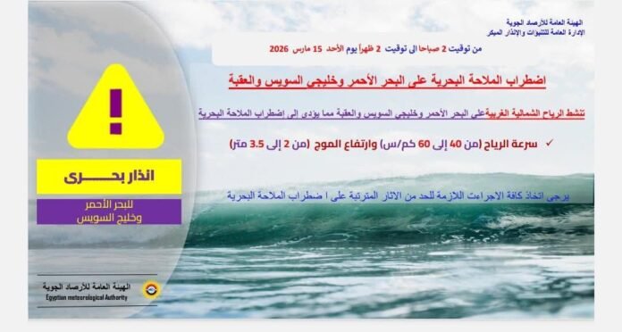 ومن المتوقع أن يشهد البحر المتوسط اضطرابًا في الملاحة البحرية، حيث تتراوح سرعة الرياح بين 50 و70 كم/س وارتفاع الأمواج بين 2.5 و4 أمتار، وكذلك على سواحل البحر الأحمر وخليج السويس وخليج العقبة حيث تتراوح سرعة الرياح بين 40 و60 كم/س وارتفاع الأمواج بين 2 و3.5 متر.