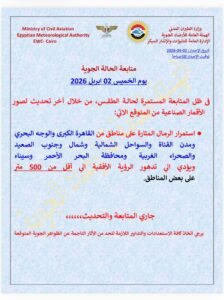 أعلنت الهيئة العامة للأرصاد الجوية، التابعة لـوزارة الطيران المدني، استمرار المتابعة الدقيقة للحالة الجوية اليوم الخميس 2 أبريل 2026، في ضوء أحدث صور الأقمار الصناعية.