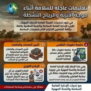 في ضوء ما أعلنته غرفة العمليات وإدارة الأزمات بالشركة، واستنادًا إلى تحذيرات الهيئة العامة للأرصاد الجوية بشأن تعرض البلاد لموجة من الرياح النشطة المثيرة للأتربة والرمال خلال الساعات القادمة، وما قد يترتب على ذلك من انخفاض في مستوى الرؤية الأفقية وتأثيرات محتملة على بيئة العمل، تهيب الإدارة العامة للسلامة والصحة المهنية بالسادة العاملين بكافة القطاعات والمحطات ومواقع العمل بالشركة ضرورة الالتزام التام بتعليمات السلامة والصحة المهنية خلال فترة سوء الأحوال الجوية، وذلك حفاظًا على سلامة العاملين والممتلكات وضمان استمرارية العمل بصورة آمنة.