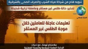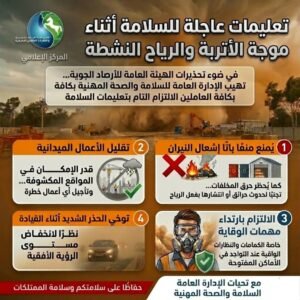 في ضوء ما أعلنته غرفة العمليات وإدارة الأزمات بالشركة، واستنادًا إلى تحذيرات الهيئة العامة للأرصاد الجوية بشأن تعرض البلاد لموجة من الرياح النشطة المثيرة للأتربة والرمال خلال الساعات القادمة، وما قد يترتب على ذلك من انخفاض في مستوى الرؤية الأفقية وتأثيرات محتملة على بيئة العمل، تهيب الإدارة العامة للسلامة والصحة المهنية بالسادة العاملين بكافة القطاعات والمحطات ومواقع العمل بالشركة ضرورة الالتزام التام بتعليمات السلامة والصحة المهنية خلال فترة سوء الأحوال الجوية، وذلك حفاظًا على سلامة العاملين والممتلكات وضمان استمرارية العمل بصورة آمنة.