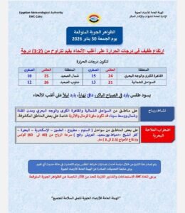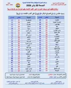 أكدت هيئة الأرصاد أن البلاد تشهد اليوم ارتفاعًا طفيفًا في درجات الحرارة على أغلب الأنحاء بقيم تتراوح من (3:2) درجة، بينما يسود طقس بارد في الصباح الباكر، دافئ نهاراً، بارد ليلاً على أغلب الأنحاء