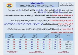 كما أشارت إلى ظهور سحب منخفضة على مناطق من شمال البلاد حتى شمال الصعيد، مع فرص لسقوط أمطار خفيفة يوم الخميس 16 أكتوبر على بعض مناطق السواحل الشمالية الغربية وشمال الوجه البحري، تكون غير مؤثرة على الأنشطة اليومية.