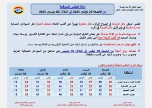وأكدت الهيئة أن الحالة الجوية مستقرة بوجه عام، مع نصيحة بمتابعة النشرات اليومية واتخاذ الاحتياطات اللازمة خلال فترات الشبورة الصباحية.
