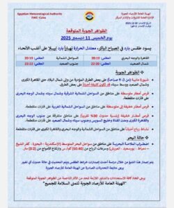 بينما تلوح فرص أمطار خفيفة بنسبة حدوث 30% تقريباً على مناطق متفرقة من جنوب الوجه البحرى والقاهرة الكبرى ومدن القناة وخليج السويس وجنوب سيناء وشمال الصعيد على فترات متقطعة.