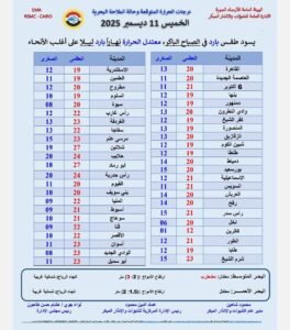 أكدت هيئة الأرصاد الجوية أنه يسود غدًا طقس بارد في الصباح الباكر، معتدل الحرارة نهاراً بارد ليلا على أغلب الأنحاء.