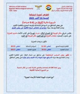 بينما يكون الطقس خريفي مائل للبرودة في الصباح الباكر ، حار نهارا على اغلب الانحاء شديد الحرارة على جنوب الصعيد معتدل الحرارة في اول الليل مائل للبرودة آخرة.