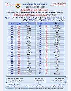 تظهر بعض السحب المنخفضة على بعض مناطق شمال البلاد حتى القاهرة الكبرى ومدن القناة ووسط سيناء قد ينتج عنها سقوط رزاز خفيف وغير مؤثر على بعض المناطق .