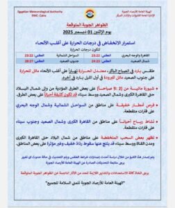 أكدت هيئة الأرصاد الجوية أنه يسود البلاد غدًا طقس بارد في الصباح الباكر، معتدل الحرارة نهاراً على أغلب الأنحاء مائل للحرارة على جنوب الصعيد، مائل للبرودة في أول الليل بارد في آخره.