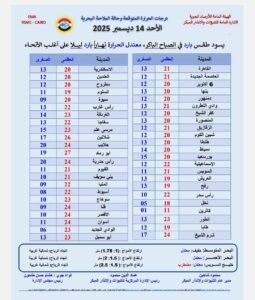 وتزداد فرص أمطار خفيفة الى متوسطة على مناطق من السواحل الشمالية وشمال الوجه البحري ومناطق من محافظة البحر الأحمر على فترات متقطعة.