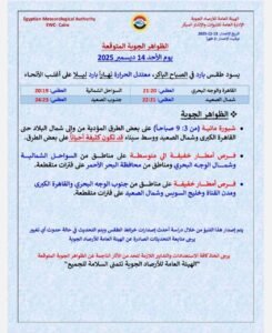 وتزداد فرص أمطار خفيفة الى متوسطة على مناطق من السواحل الشمالية وشمال الوجه البحري ومناطق من محافظة البحر الأحمر على فترات متقطعة.