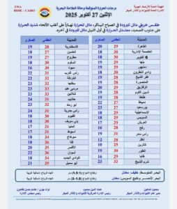 أعلنت هيئة الأرصاد الجوية أنه يسود البلاد غدا الإثنين 27 أكتوبر 2025، طقس خريفي مائل للبرودة في الصباح الباكر، مائل للحرارة نهاراً على أغلب الأنحاء شديد الحرارة على جنوب الصعيد معتدل الحرارة في أول الليل مائل للبرودة في آخره.