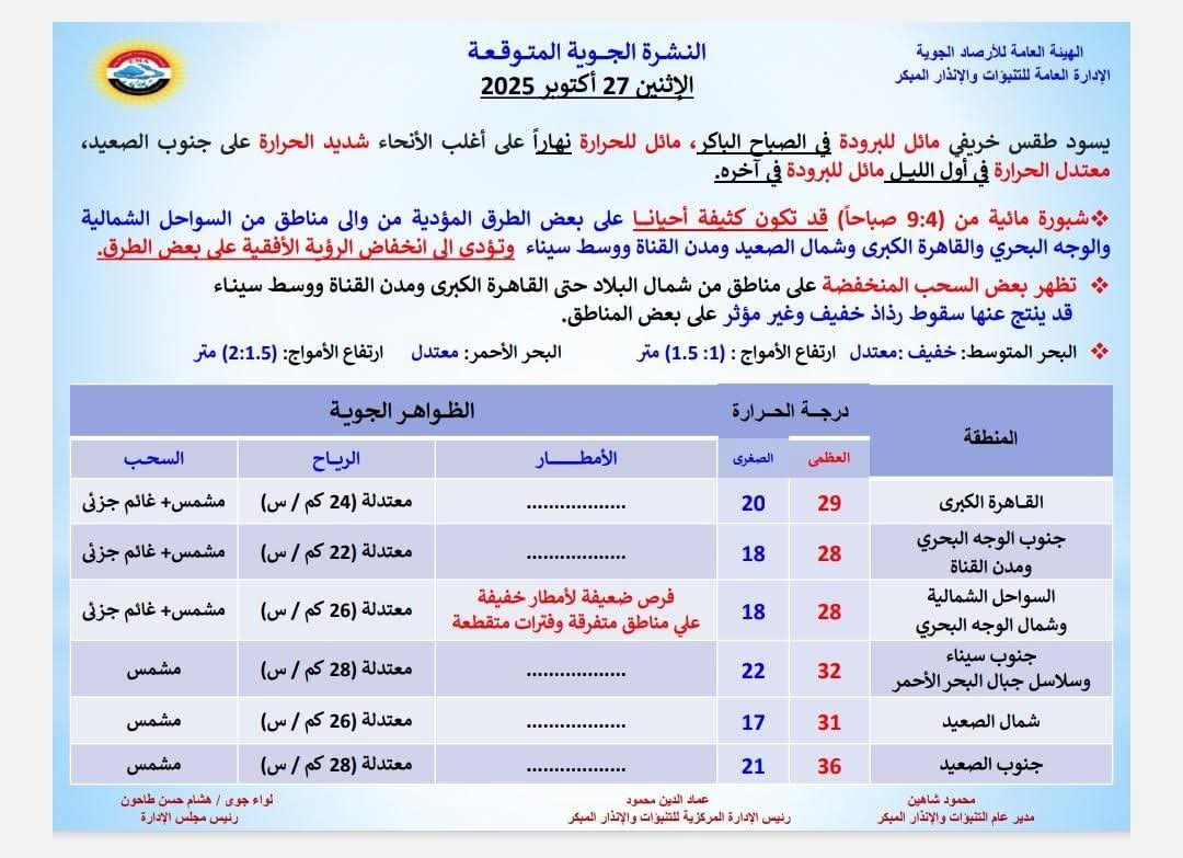 أعلنت هيئة الأرصاد الجوية أنه يسود البلاد غدا الإثنين 27 أكتوبر 2025، طقس خريفي مائل للبرودة في الصباح الباكر، مائل للحرارة نهاراً على أغلب الأنحاء شديد الحرارة على جنوب الصعيد معتدل الحرارة في أول الليل مائل للبرودة في آخره.
