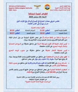 كما يشهد جنوب الوجه البحري فرصًا ضعيفة لسقوط الأمطار على مناطق متفرقة، وعلى فترات متقطعة.
