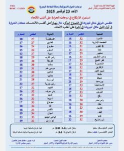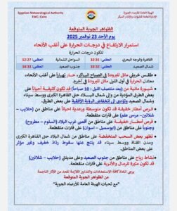 أكدت هيئة الأرصاد الجوية أن الظواهر الجوية المتوقعة غدًا الأحد 23 نوفمبر 2025، تشير إلى استمرار الارتفاع في درجات الحرارة على أغلب الأنحا.