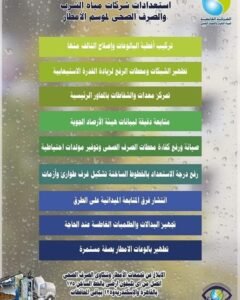 1- ترشيد استهلاك المياه خلال فترة سقوط الأمطار لتخفيف الضغط على شبكات الصرف الصحي لاستيعاب أكبر كمية ممكنة من مياه الأمطار.