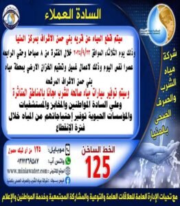 كما أكدت الشركة علي المواطنين التواصل مع غرفة العمليات وخدمة العملاء على الخط الساخن 125 في حال طلب سيارات المياه أو تقديم أي شكاوى أو استفسارات.