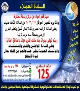 وشددت شركة مياه المنيا على حرصها الدائم على تقليل مدة الانقطاع، مع الالتزام بأعلى معايير السلامة والجودة، مشيرة إلى أنه يمكن للمواطنين التواصل عبر الخط الساخن 125 في حال وجود أي شكاوى أو استفسارات.