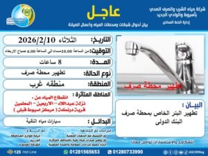 أعلنت شركة مياه الشرب والصرف الصحي بأسيوط والوادي الجديد بأنه سيتم إجراء استكمال أعمال تطهير البئر الرئيسية بمحطة صرف البنك الدولي بالمعلمين بحى غرب مدينة أسيوط وذلك مساء الثلاثاء الموافق 10 فبراير 2026م لمدة 8 ساعات من الساعة 10مساء إلى 6 صباح الأربعاء الموافق 11 فبراير 2026م