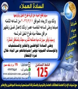 وناشدت الشركة المواطنين وأصحاب المنشآت الحيوية تدبير احتياجاتهم من المياه مسبقًا لحين الانتهاء من الأعمال وعودة الخدمة، مشيرة إلى إمكانية التواصل مع الخط الساخن 125 أو عبر قنوات الاتصال الرسمية للشركة للاستفسار وطلب سيارات المياه.